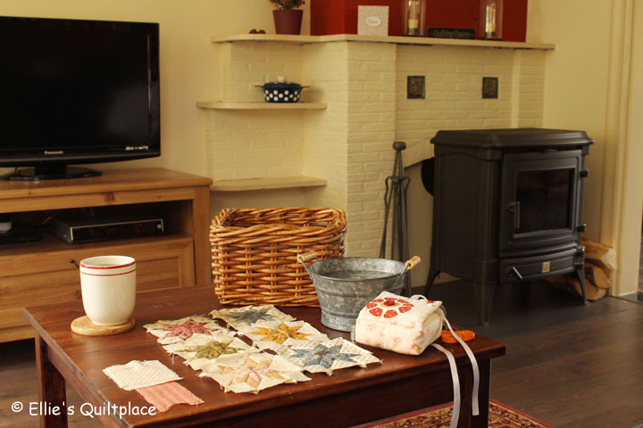 Nu alles netjes voorbereid is, kan ik aan de slag! Als ik na het werk thuis kom (en eten heb gekookt, de keuken heb opgeruimd en alle bestellingen, e-mails en andere Ellie's Quiltplace-dingen heb gedaan), pak ik mijn mandje, pak ik blok nummer 1 en kan ik beginnen.